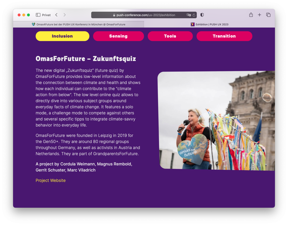 Ganz kurzfristig sind gleich zwei 4Future-Gruppen als Aussteller auf der PUSH UX Konferenz in München vertreten. Die Kooperation "Zukunftsquiz" zwischen CreativesForFuture und Omas4Future wird eines der Ausstellungsstücke sein.